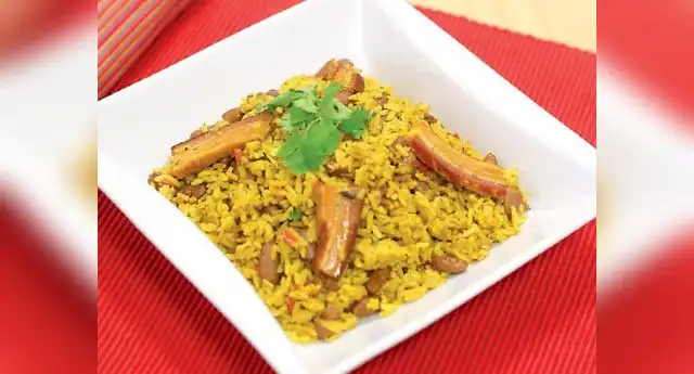 Remojar los frejoles el día anterior, cambiar el agua y cocinar por 90 minutos. Calentar el aceite por 2 minutos, freír la costilla de cerdo, la cebolla y los ajos. Dorar por unos minutos y agregar el curry, pimientos, tomate, tomillo, orégano, laurel, sal y pimienta. Luego añadimos el arroz, los frejoles y el caldo de carne. Dejar cocinar.Receta de Edith León, chef de Oster.