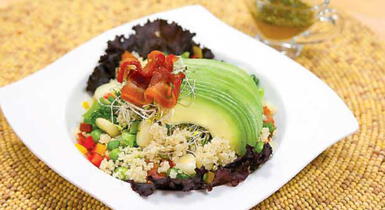 INGREDIENTES250 gr de quinuaCaldo de vegetales1 cda de mantequilla1/2 de tz choclo cocido1/2 tz de arvejitas cocidas1/2 tz de cebolla cortada fina (la parte verde)1/2 tz de pimiento rojo, amarillo y verde picadoUna palta picada en cubos100 gr de tocino crujiente y perejil picadoAliñoZumo de limón, aceite oliva Mostaza, brotes de alfalfa, sal y pimienta