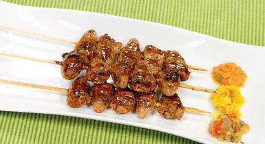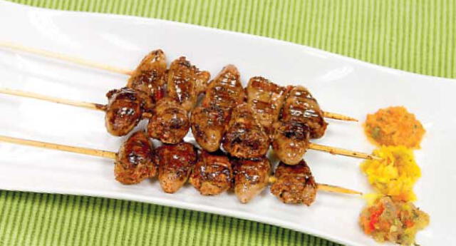 INGREDIENTES1 kg de corazón de pollo.2 cdas. de ajo molido.½ cdta. de comino molido.1 vaso de vinagre rojo.2 cdas. de ají panca .Sal y pimienta al gusto.Palitos para brochetas.