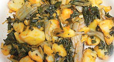 Sancocha las acelgas en agua. En una sartén fríe las papas y la cebolla, como para tortilla. Agrega el ajo en cuadraditos. Tritura en un mortero el otro ajo y el perejil. Luego añade vino y agua. Mezcla con el resto de ingredientes, y deja hervir durante 5 minutos. Añade por encima los huevos batidos y el queso rallado y gratina por 10 minutos en el horno.
