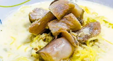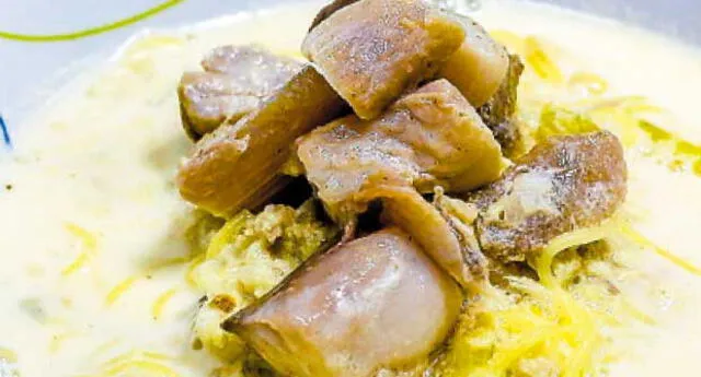 Lava el pescado y trózalo como para cebiche, coloca 3 litros de agua en una olla y hierve la mitad del pescado picado junto con el kion, apio y cebolla, reserva la otra mitad en la refrigeradora. Luego cuela el caldo, licúa el pescado, el kion, el ajo y las cebollas y agrega la leche. El pescado reservado lo marinas con sal y pimienta y agrega un poco de zumo de limón y medio litro del caldo de pescado licuado. Coloca el sobrante del caldo en una olla y llévalo a fuego lento. Añade los fideos hasta que esté al dente, retira del fuego y sirve, en cada plato coloca un poco del pescado marinado.
