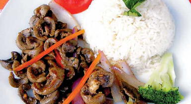 INGREDIENTES1 y 3/4 tz. de arroz.1/2 kg de riñones.2 cebollas.2 tomates.2 cdtas. de ajo.1/3 tz. de aceite vegetal.1 cda. de sillao.1/4 tz. de vinagre.1 tz. de brócoli.Comino y pimiento.Sal al gusto.