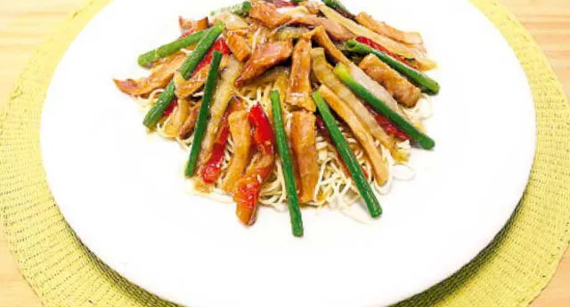 INGREDIENTES½ kilo de fideos fritos.½ kilo de lomo de chancho.1 atado de cau choy (ajo chino).350 g de col china.3 tronquitos de apio blanco.1 cebolla criolla.1 ajo molido.½ cdita. de sazonador.1½ cdta. de chuño.Pimienta blanca.1 cda. de sillao.