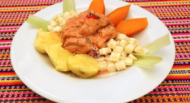 INGREDIENTES 600 gr de filetes de trucha fresca. Jugo de 8 limones. 2 dientes de ajo picado. 2 cebollas. 1 cdta. de crema de rocoto. 1 ají limo picado. 1 cda. de culantro picado. 1 choclo. 2 papas harinosas. 2 camotes.PREPARACIÓNCorta en dados la trucha y agrega sal, ajo, crema de rocoto, pimienta, kion y espera unos minutos. Luego echa el jugo de limón y mezcla todo, después agrega el apio en láminas delgadas.Sirve el cebiche con la cebolla cortada en pluma, acompaña con tajadas de camote, papa y choclo desgranado.Paola Palacios, chef del Restaurante Turístico Huancahuasi.