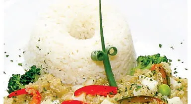 INGREDIENTES 1 ½ de taza de quinua. ½ k de pota. 1 pimiento mediano. 1 cebolla mediana. ¼ de tz. de aceite vegetal. 4 dientes de ajos. 3 cdas. de maní tostado. Orégano. Sal.PREPARACIÓNSancocha la quinua. Adereza con ajos, cebolla picada en cuadraditos y orégano, agrega el pimiento cortado en tiras delgadas y la pota cortada en cuadrados medianos condimentados con ajos y sal. Deja cocinar. Agrega poco a poco la quinua sancochada con el maní tostado y molido. Mezcla suavemente y deja que cocine unos minutos. Sirve con papas sancochadas en rodajas.Receta del Instituto Nacional de Salud.