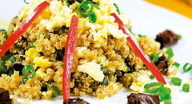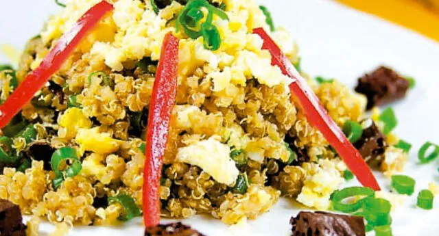 Sancochar la quinua. Lavar la sangre de pollo, sancocharla con ajo y hierbabuena. Cortar en trozos pequeños y aderezar con sal. Batir los huevos, freír y picarlos. Hacer un aderezo con el kion molido, la cebolla china cortada en trozos largos, la sangre de pollo aderezada, el pimiento picado en cuadraditos y la sal. Dar vueltas y probar la sazón. Luego incorporar poco a poco la quinua sancochada, el sillao y el huevo picado.Receta del Instituto Nacional de Salud.