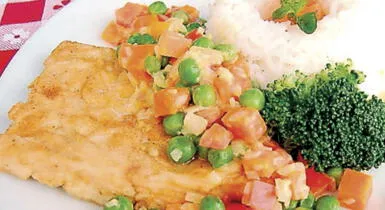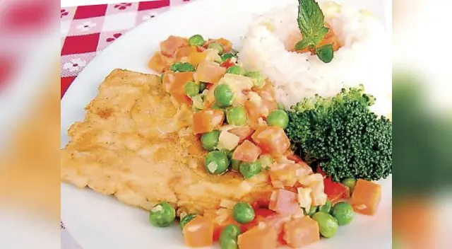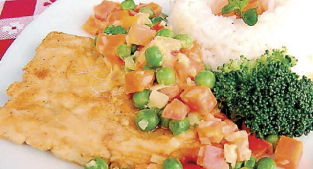Sancochar las alverjas. Lavar, filetear el pescado, condimentar con sal y pimienta; apanar con pan molido y freír en aceite vegetal. Reservar. Freír en aceite vegetal, la cebolla picada en cuadraditos, los ajos, el ají colorado y el tomate picado. Condimentar con pimienta y sal. Añadir la zanahoria, alverjas, choclo, agua, hongos y laurel. Cocinar. Servir el pescado a la primavera acompañado de arroz y ensalada de brócoli.