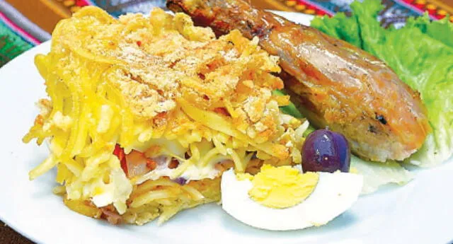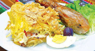 Sancochar los fideos y cuatro huevos. Freír la cebolla y el tomate picados en juliana, el ajo molido y el ají colorado molido. Barnizar la fuente con aceite, colocar una capa de fideos sancochados, el encebollado, las rodajas de huevo y las aceitunas despepadas y picadas, cubrir con otra capa de fideos. Echar a la preparación anterior leche, huevo batido a punto de nieve, espolvorear un poquito de pan rallado y llevar al horno. Condimentar el pollo con ají colorado, sal, comino y pimienta. Luego llevar al horno juntamente con el tallarín.