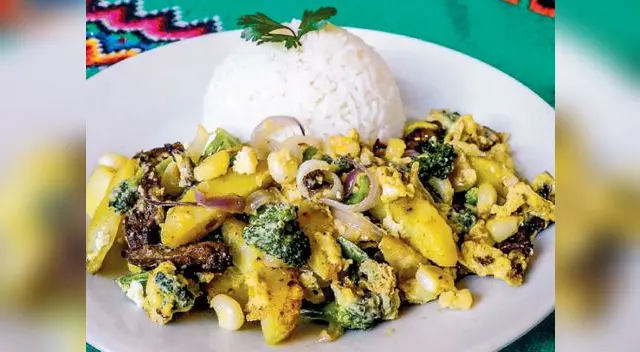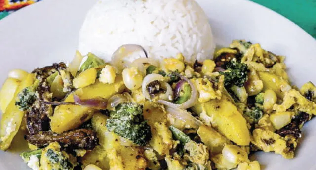 Pelar y picar las papas. Freír en aceite vegetal la cebolla cortada en tiras, los ajos picados. Agregar la papa cortada en tiras delgadas, el choclo desgranado y el brócoli picado, hervir. Finalmente adicionar los huevos batidos y el queso estrujado; cocinar. Dorar en aceite vegetal el relleno. Servir el saltadito de brócoli acompañado de relleno dorado y arroz graneado.