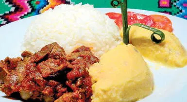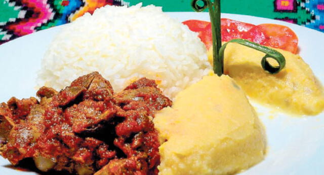 Servir el puré de garbanzos con arroz graneado, el asado de riñón y palta.