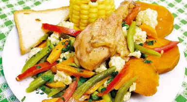 Mezcla todo en la fuente y deja reposar. Sirve el escabeche de pollo acompañado de rodajas de camote sancochado y pan de molde.