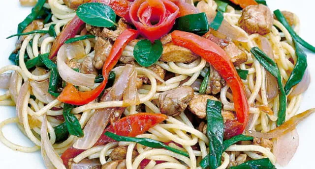 400 g de fideos tallarín. ½ kg de pollo.2 cebollas.6 cabezas de cebolla china.1 tomate.