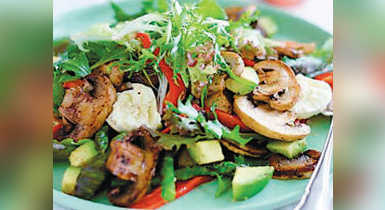 150 gr de champiñones en láminas.200 gr de queso parmesano en láminas.1 cebolla en láminas.1/2 lechuga en trozos.1 tallo de apio picado.1 cda. aceite de oliva virgen.1 limón.Sal.