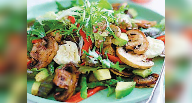 En un bowl, mezclar el queso, la cebolla, el apio, la lechuga y los champiñones. Aliñar con sal, aceite y limón. Mezclar y servir con carnes rojas.