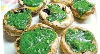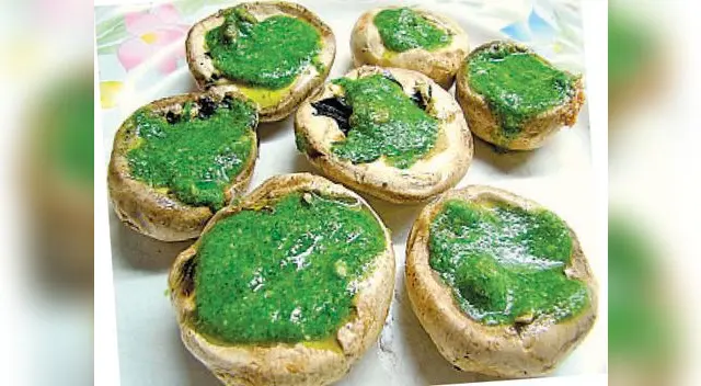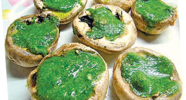Quitar los tallos a los champiñones y cocinar a la plancha con aceite de oliva. Luego, agregar sal al gusto a cada champiñón. Cortar los tomatitos cherrys por la mitad y colocar una mitad en cada champiñón. Dar la vuelta a los champiñones con cuidado. Servir y agregar un poco de salsa pesto a cada uno.
