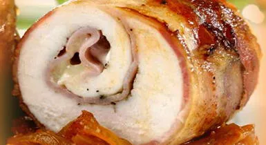 Condimentar y abrir la pechuga de pavo, agregarle sal y pimienta, rellenar con el queso, jamón y los espárragos, darle forma atándolo con pabilo. Precalentar la Multiolla Rápida Oster, en función sofreír, derretir la mitad de la mantequilla o margarina y sellar el enrollado. Agregar vino. Colocar en la bandeja y llevar al horno 30 minutos, rociando con el líquido de la preparación durante la cocción. Servir cortando en tajadas con puré de papa, vegetales o arroz blanco.