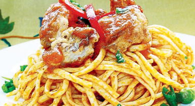 Limpiar, lavar el pescado, cortar en trozos medianos y sazonarcon sal y freír. Freír en el aceite vegetal, tomate y cebolla cortados en cuadraditos, zanahorias ralladas, hongo y laurel. Licuar, agregar trozos de pescado y cocinar.Servir tallarines con salsa de pescado.