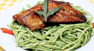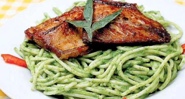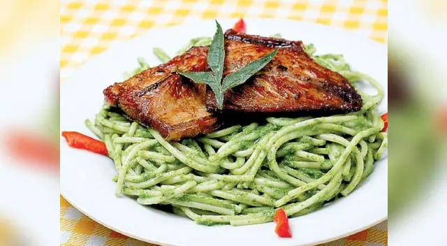 Sancochar el fideo tallarín. Lavar el pescado, filetear, condimentar con ajo, limón, sal yodada, pimienta y freír en aceite vegetal. Freír en aceite vegetal la cebolla picada en cuadraditos, los ajos finamente picados; agregar la espinaca y albahaca, y hervir. Finalmente, licuar junto con la leche y el queso. Mezclar la salsa verde con los fideos. sancochados y servir con pescado frito.