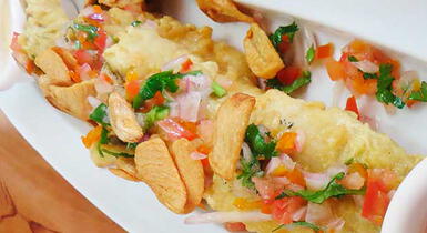 En un bol batir los huevos y agregar harina, ajos y perejil, condimentar con sal y pimienta, mezclar bien. Pasar los pejerreyes limpios por la mezcla e inmediatamente freírlos en aceite caliente. Preparar la chalaquita uniendo la cebolla, tomate, rocoto y ají amarillo, el choclo, culantro picado y condimentar con sal, pimienta, jugo de los limones y un chorrito de aceite.