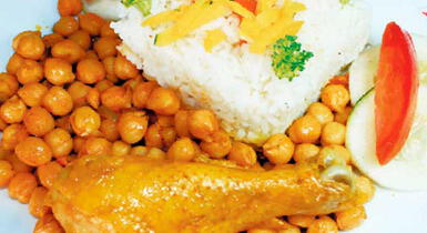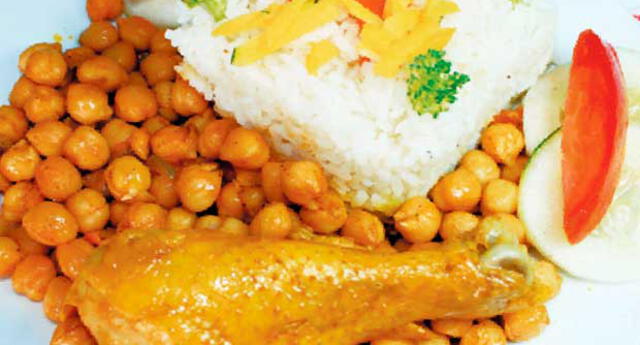 Limpiar, lavar, remojar el día anterior los garbanzos y sancochar. Limpiar, lavar el pollo, cortar en cuatro presas y agregar la sal. Freír en aceite, la cebolla cortada en cuadritos con el ajo molido, el pollo y cocinar. Preparar la ensalda con el tomate, la lechuga, el pepinillo, el jugo de limón y la sal. Servir el pollo mechado con garbanzo acompañado de arroz graneado y ensalada.