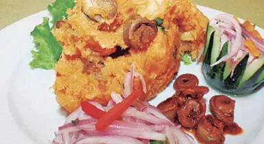 Lavar, pelar, trozar, sancochar la yuca, prensar y reservar. Picar los corazones de pollo y sazonar con sal. Freír. En otra sartén, freír el ají colorado, el ajo; agregar la cebolla picada, la chicha de jora, la yuca prensada y cocinar a fuego lento. Preparar la ensalada fresca con lechuga, el jugo de limón y sal al gusto. Servir el majado de yuca con corazón acompañado de los snacks.