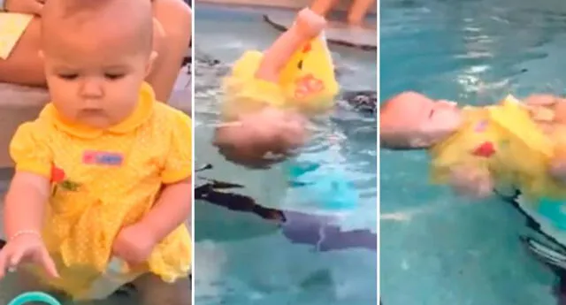 La pequeña quedó durante unos segundos boca abajo, provocando que cada persona expectante del vídeo quede sin aliento, pero sorprendentemente logró reincorporarse sola y en un instante comenzó a flotar instintivamente.