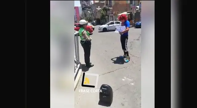 En el video difundido en Facebook por Paolo Medina se observa a la agente que pertenece a la Policía de Tránsito realizando sus labores cuando aparece su pareja vestido de payaso y con un parlante de música.