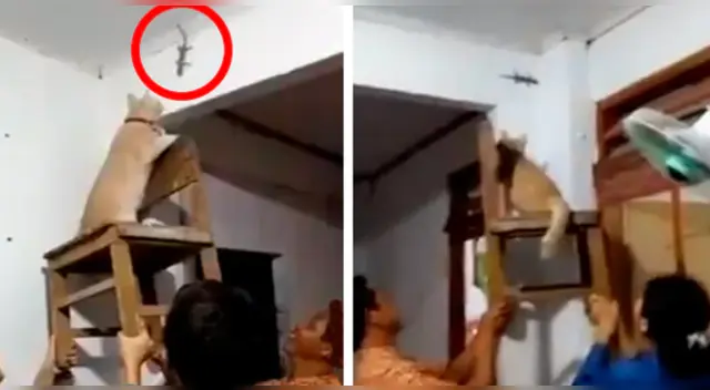 En el video viral compartido en las redes sociales, se observa cómo los dueños suben al gato encima de una silla para que logre espantar al animal que yace en las paredes, sin ánimos de abandonar la casa y moviéndose velozmente para que el minino no lo atrapara.