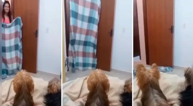 En el video viral se observa cómo la mujer se ayuda con una sábana para 'desaparecer' y hacerles creer a sus perros que se había ido. Al instante, los perros ven la zona despejada y comienzan una inesperada batalla como si uno de los dos tuviera la culpa de la desaparición de su dueña.