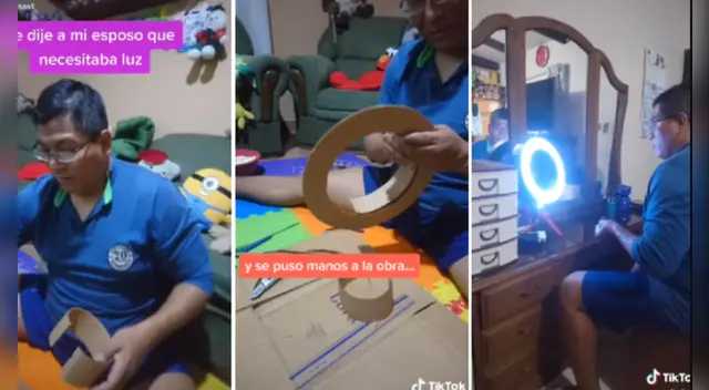 En las imágenes virales de TikToK se observa el procedimiento que realiza el hombre para construir el aro de luz, quien se encuentra rodeado de todos los materiales para crear el improvisado reflector, mientras que su esposa lo graba. Asimismo, la dedicación de su esposo por ayudarla no pasa desapercibido por la mujer que en muestra de su gratitud decide agradecerle compartiendo un video sobre improvisado reflector hecho a mano, sin imaginar que se volvería tendencia en las redes sociales.