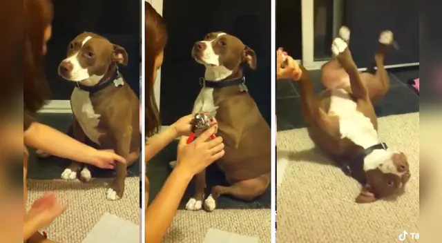 Asimismo, la joven le pide la patita a su perro y este no le hace caso por lo procede a coger una al azar y lo alza para proceder a cortar sus largas uñas. Sin embargo, su mascota se desvanece de una manera 'dramática' para no dejar que le realizaran la limpieza, logrando que la actitud del animal dejara atónita a su cuidadora por su particular comportamiento.