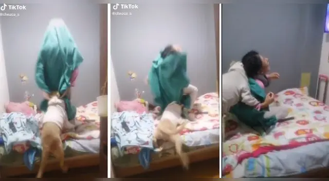 En las imágenes virales se observa cómo la joven está preparándose para realizar otro reto de baile en TikTok y cubierta de unas frazadas. A continuación, se muestra a la joven saltando sobre su cama para bailar “Qué locura fue enamorarme de ti”, pero detrás de ella aparece su perro para detenerla con un gran salto empujando a la joven a tiempo para que no realizara la coreografía.
