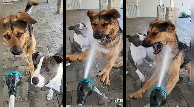 En las imágenes virales de TikTok muestran cómo ambos animales están ansiosos de que salga el agua de la manguera que está en las afueras de su vivienda, mientras que su dueño los graba para ver su reacción. Luego al prenderlo empiezan a salir chorros de agua y los canes empiezan a querer atraparlo y se divierten de una simpática manera.