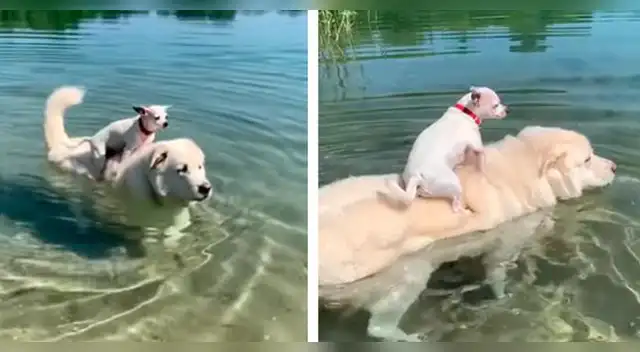 Como se observa en las imágenes virales de Facebook, el perro deja que su compañero de raza chihuahua se suba en su lomo para pasearlo y que se adapte al gua y deje sus miedos atrás y dieron vueltas por todo el lago. Con sumo cuidado, el adorable animal llevó a su temeroso ‘amigo’ para que disfrutara del agua tanto como él.