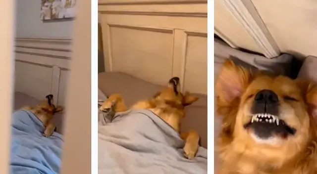 En las imágenes virales de Facebook se observa cómo el dueño abre despacio la puerta de su cuarto y ve a su travieso perro durmiendo muy cómodo en su cama. No obstante, lo curioso del hecho es que el tierno can permanece sin despertarse y echado boca arriba con su hocico entre abierto mostrando sus colmillos.