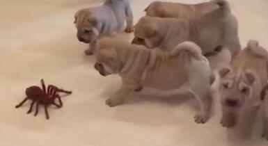 Cachorros se enfrentan a una tarántula de juguete y tienen adorable reacción [VIDEO]