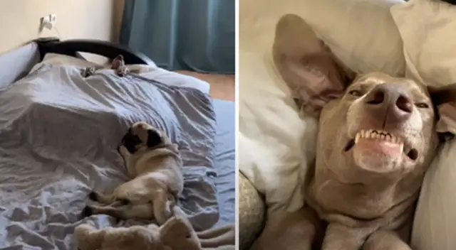 Asimismo, en el clip viral compartido en las redes sociales, el joven avanza lentamente y uno de sus canes lo observa y avergonzado mira a su ‘hermano’, quien está cubierto con las sábanas y durmiendo como si fuera un humano, por lo que decide acercarse y cuando lo hace el perro lo mira sonriente al no tener escapatoria tras ser descubierto por su amo.