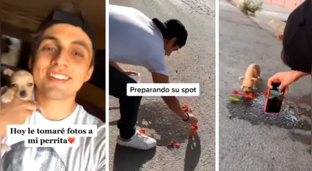 En las imágenes virales de TikTok se observa cómo el joven le improvisa una bella escenografía a su mascota recién nacida en plena calle para tomarle bellas fotos de recuerdo.