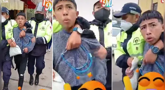 En las imágenes virales de TikTok se observa cómo el delincuente es llevado por tres agentes policiales y uno de ellos capta el momento con su celular. Sin embargo, cuando el sujeto se da cuenta que lo estaban grabando empieza a quejarse y a pedir que no lo filmen, pero al ver que no le hacían caso soltó una frase que en vez de amedrentar causó las risas de los presentes.