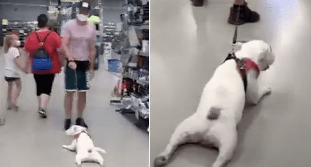 En las imágenes virales de YouTube se observa cómo el perro espera echado a su dueño que se ha encontrado con unos conocidos en el supermercado y, una vez terminada la conversación, el can continúa en el suelo sin pararse y el hombre al no saber qué hacer lo intenta jalar para obligarlo a pararse, pero no lo logra.