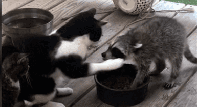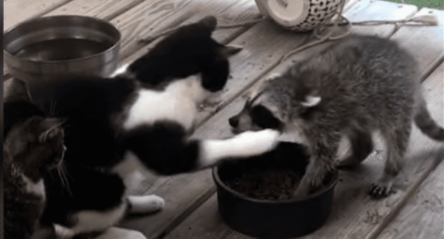 Gato se incomoda con mapache por robarse su comida y ambos protagonizan cómica escena [VIDEO]
