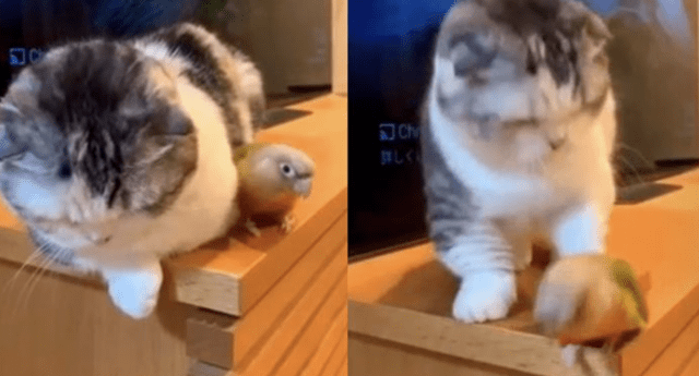 Asimismo, en el clip viral compartido en las redes sociales, el minino se percata que el loro está muy cerca del borde del mueble y lo empuja sorpresivamente para alejarlo y poder conciliar el sueño tranquilo.