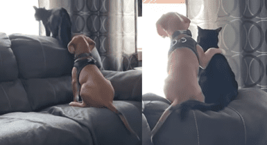 En las imágenes virales de YouTube se observa cómo el perro mira a su ‘amigo’, quien se encuentra sentado en el sillón de sala y mirando hacia la ventana. Después de unos segundos, se sube al sillón para estar con él y alza una de su patas para atraerlo hacía él y darle un ‘fuerte abrazo’. El gato, lejos de incomodarse, permaneció tranquilo y movió su cola al instante que estuvieron juntos.