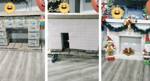 En las imágenes virales de TikTok se observa cómo la familia utiliza varios cartones reciclados para formar como una ‘chimenea’ en la sala de su hogar y luego lo pegan con cinta masking transparente para que no se desestabilicen. Finalmente, le colocan papel blanco para que dé la ilusión de una pared y el resultado final es sumamente increíble.