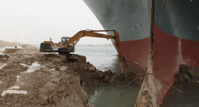 Este enorme baro puede transportar hasta 20mil contenedores y su encallamiento ha impedido que otros barcos puedan circular por este estrecho canal que conecta África con Asia, por lo cual un excavadora que se ve diminuto al lado del inmenso barco trata de moverlo sin tener éxito.