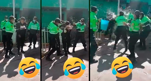 “¡No lo manchen!”, se oye decir a uno de los efectivos policiales en medio de carcajadas. Por si fuera poco, a aparecieron en escena otros más policías que corrieron presurosos con baldes de agua para ‘bañarlo’ de pies a cabeza.