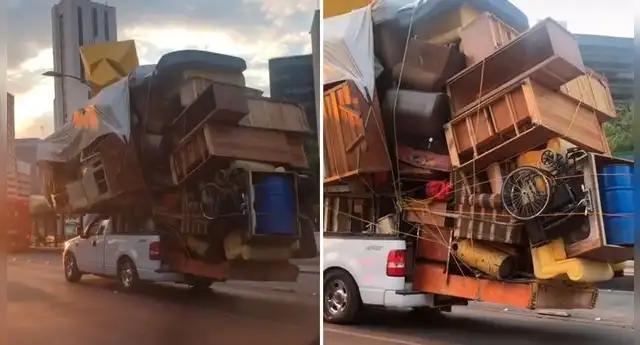 En el curioso video viral de TikTok se puede ver cómo la camioneta blanca transportaba más de 10 muebles en una sola ida.