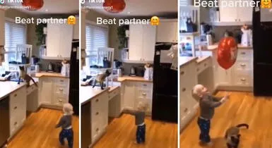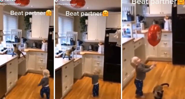 En las imágenes virales de TikTok se observa cómo el gato trepa la mesa de la cocina para alcanzar el globo de su pequeño amo. Con sus pequeñas garras, intenta varias veces bajarlo y al final lo consigue.