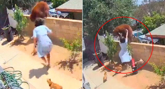 En las imágenes se logra ver cómo la joven empuja a la osa, haciendo que caiga hacia atrás del muro, momento que ella aprovechó para tomar a sus perros y llevarlo al interior de su casa. El increíble viral logró obtener más de 62 millones de reproducciones en redes sociales.