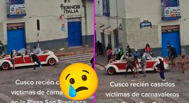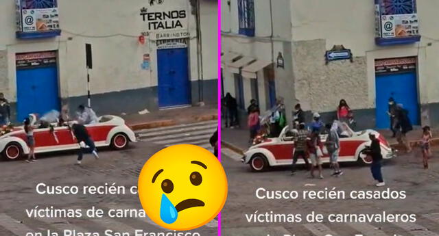 Las imágenes fueron grabadas en Cusco, por un transeúnte que se encontraba en la otra calle donde ocurrió el ataque. “Recién casados víctimas de carnavaleros en la Plaza San Francisco”, se lee en la descripción del viral de TikTok.